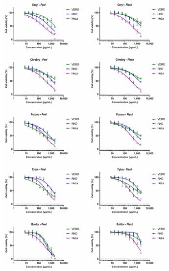 Overall, the extracts obtained from the flesh of tested cultivars were less toxic to non-cancerous cells than the peel extracts obtained from the same plant material, except the Chrobry cultivar. Interestingly, the extracts of the peel and flesh of the Ceryl and Chrobry cultivars showed lower toxicity on VERO cells than those obtained from the Forono and Tytus cultivars. In the case of the Boldor cultivar, extracts from flesh showed the lowest observed toxicity among all tested samples with CC50 of 4948.6 μg/mL, and the extracts from peel were significantly more toxic (CC50 527.7 μg/mL). Taking into account the classification of plant extracts cytotoxicity [56,57] extracts from tested cultivars can be regarded as non-cytotoxic (CC50 > 500 μg/mL) to VERO cells, except peel extracts from Forono and Tytus cultivars where weak cytotoxic activity (CC50 201–500 μg/mL) was observed. The peel extract from the Boldor cultivar showed weak cytotoxicity towards both cancer cell lines without showing a cytotoxic effect on non-cancerous cells. HeLa cells were noticeably more sensitive to most of the extracts tested than VERO and RKO.