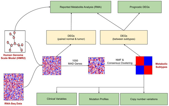 The pipeline for identifying and characterizing metabolic subtypes of EC using the transcriptomic data is shown in Figure 1. The metabolic genes present in the human genome-scale metabolic model (HMR2.0) were considered for the analysis. HMR2.0 has been extensively used for generating metabolic models of normal tissues and disease conditions [29,30,31,32,33]. Out of 3765 metabolic genes present in HMR2.0, 3584 were present in the gene expression dataset. The median absolute deviation (MAD) was computed for all metabolic genes. The top 1000 genes based on the MAD score were selected as a seed list for dimension reduction and clustering. This pre-filtering step eliminates the majority of genes and retains only genes with high MAD scores greater than 0.9. We adopted a Non-Negative Matrix Factorization (NMF)-based consensus clustering approach to identify clusters.