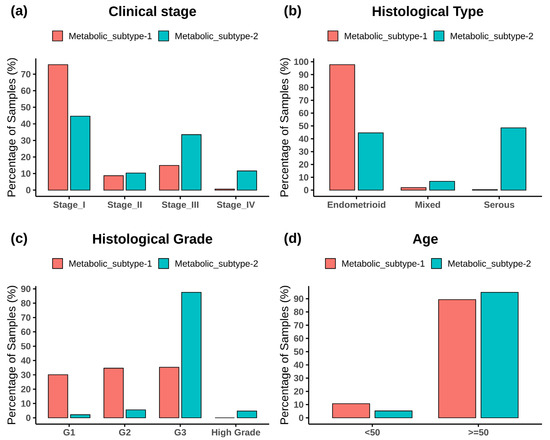 Figure 3 shows the subtype-wise distribution across stages, histological types, grades, and ages. Fisher’s exact test showed that both subtypes are significantly related to the clinical variables (p-value < 0.05) (Table S2). Metabolic subtype-1 is dominated by stage 1 samples, whereas metabolic subtype-2 is dominated by stage 3 and stage 4 samples (Figure 3a). Stage 2 samples are almost equally distributed into both subtypes. The Cramer’s V value of 0.36 shows a moderate association between clinical stage and metabolic subtypes. Metabolic subtype-1 mainly consists of endometrioid samples, while metabolic subtype-2 comprises all histological types (Figure 3b). Both serous and endometrioid types have an almost equal distribution in subtype-2 samples. The Cramer’s V value of 0.61 describes strong relationships between metabolic subtypes and histological types. Metabolic subtype-1 consists primarily of grade 1 to 3 samples (Figure 3c). However, the grade 3 samples are more in metabolic subtype-2 compared to metabolic subtype-1. All high grades samples only belong to metabolic subtype-2. The Cramer’s V value for a histological grade is 0.58, which indicates a strong relationship between them. In addition, we divided the samples into two categories to perform Fisher’s exact test between age and clusters (<50 years and 50 years). The association of age with metabolic subtypes is significant (p-value = 0.02), but Cramer’s V value for age is very small (0.098), indicating a negligible association of metabolic subtypes with age (Figure 3d).