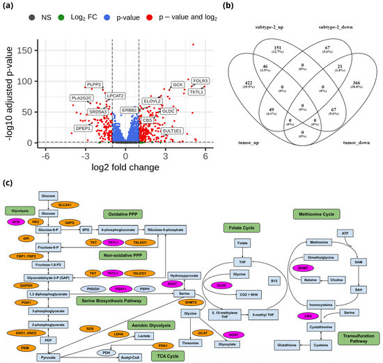 (a) Volcano plot showing DEGs between metabolic subtype-1 and subtype-2 samples. (b) Venn diagram showing the overlap of DEGs between metabolic subtype-1 vs. metabolic subtype-2 and normal vs. tumor comparisons (subtype-2_up: upregulated genes in metabolic subtype-2, subtype-2_down: downregulated genes in metabolic subtype-2, tumor_up: upregulated genes in the tumor, tumor_down: downregulated genes in the tumor). Venny 2.1 was used to generate the Venn diagrams. (c) Metabolic pathways altered in EC and metabolic subtype-2 samples. Orange and pink colors represent upregulated genes in normal vs. tumor conditions and metabolic subtype-1 vs. metabolic subtype-2 conditions, respectively.