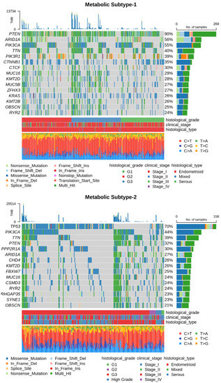 Next, we utilized somatic mutation and CNV datasets to characterize each subtype at the genome level. The somatic mutation datasets for metabolic subtype-1 and subtype-2 consisted of 300 samples (out of 309) and 225 samples (out of 233), respectively. Table S3 summarizes the mutation profile of metabolic subtype-1 and subtype-2 samples. The mean Tumor Mutation Burden (TMB) per Mb of metabolic subtype-2 (32.38) was higher compared to metabolic subtype-1 (25.78) samples. The five most frequently mutated genes in metabolic subtype-1 samples were PTEN (90%), AR1D1A (56%), PIK3CA (55%), TTN (40%), and PIK3R1 (39%) (Figure 6). On the other hand, TP53 (70%), PIK3CA (44%), TTN (39%), PTEN (32%), and PPP2R1A (30%) were the top five frequently mutated genes in metabolic subtype-2 samples (Figure 6). TTN is frequently mutated in both subtypes.