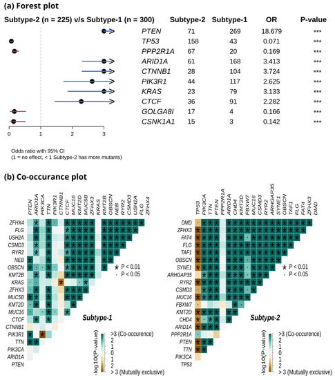 (a) Forest plot shows differentially mutated genes between metabolic subtype-1 and subtype-2 samples. The symbol *** represents the p-value < 0.001. (b) Co-occurrence analysis between frequently mutated genes of metabolic subtype-1 and metabolic subtype-2 samples.