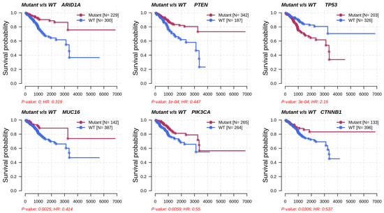 Metabolic subtype-2 includes samples with TP53 mutation, while metabolic subtype-1 has PTEN mutations. To further investigate, we analyzed the co-occurrence/mutually exclusive relationships of the 20 most frequently mutated genes in both subtypes. Figure 7b shows that TP53 and PTEN exhibit mutually exclusive behavior (p-value < 0.01). TP53 is also mutually exclusive with other frequently mutated genes in metabolic subtype-2 samples, except for PPP2R1A. It has also been reported that PPP2R1A mutation is associated with poor survival in breast cancer, lung cancer, and melanoma [49]. The co-occurrence of PTEN along with OBSCN, ZFHX3, KMT2D, MUC16, and TTN was observed in metabolic subtype-1 and metabolic subtype-2 samples (Figure 7b). Further, we performed a survival analysis of the frequently mutated genes to reveal their impact on the survival outcomes of EC patients. Among these genes, six genes had a significant (p-value < 0.05) association with survival (Table S4). Patients with PTEN mutation have better survival than those without PTEN mutation (Figure 8). Similarly, the genes AR1D1A, MUC16, PIK3CA, and CTNNB1 are related to better survival (hazard ratio < 1) of EC patients (Figure 8). In contrast, patients with TP53 are significantly associated with poor survival.