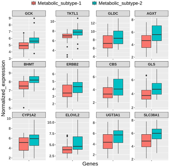 Boxplot showing the expression pattern of candidate genes between metabolic subtypes identified in the GEO validation dataset.
