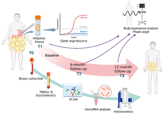 The outcome measures are primarily the anthropometric data; body composition analysis with PhA; biochemical parameters; miRNA levels; adipose tissue gene expressions; dietary patterns; and metabolomic profiles. After an overnight fast of 8–12 h, blood samples will be taken for HbA1c (glycated hemoglobin A1c), liver, renal, and lipid profiles, hormones, and adipokines, as well as metabolomic analysis. Later, miRNA will be extracted from the serum. Figure 2 shows the proposed research workflow.