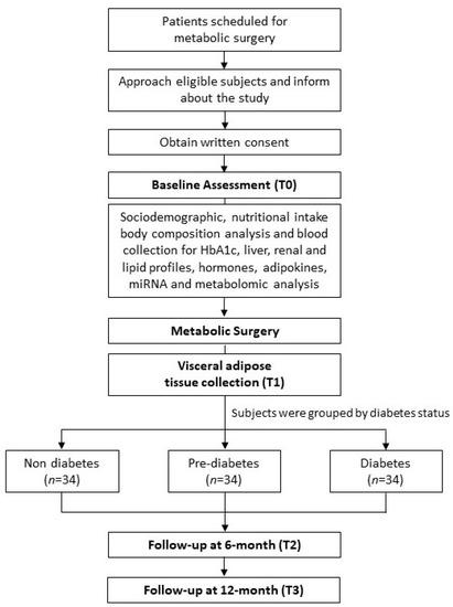 This is a multicenter prospective longitudinal study of patients with obesity and with different diabetes statuses who are scheduled for metabolic surgery at the Hospital Kuala Lumpur, iHeal Medical Centre KL, Sunway Medical Centre Selangor, Sunway Medical Centre Velocity KL, and KPJ Damansara Specialist Hospital, Malaysia. The two most standard metabolic surgical procedures performed at these hospitals are laparoscopic SGs and RYGBs. Serial measurements of the selected markers will be taken pre-operatively (baseline, T0) and at 6- (T2) and 12-month (T3) follow-ups after surgery. Visceral adipose tissue will be collected during surgery (T1). An overview of the scheduled sample collections for analysis is shown in Table 1. Figure 1 displays the design and methods that will be used in this study.