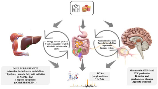 The main involved metabolic mechanisms concern a greater ability to extract energy from nondigestible polysaccharides by intestinal microbes [64], with the production of SCFAs and a consequent modification of food absorption. At the metabolic level, a decrease in the ability to oxidize fatty acids in the muscle mediated by the decrease in AMP kinase, a sensor of the cellular energy state; an increased hepatic lipogenesis via ChREBP/SREBP-1; and an alteration of the metabolism of bile acids, which affects the correct transport of cholesterol, were also observed [64].