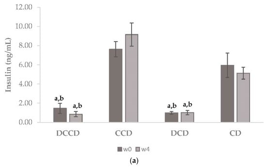 Plasma insulin concentrations were lower in the DCD and DCCD groups (p < 0.001), compared to CD and CCD, at the beginning of the study. At the end of the dietary intervention, insulin levels remained low in both diabetic groups (p = 0.007 and p = 0.001 for DCD and DCCD, respectively). No effects of Corinthian currant consumption were reported regarding insulin levels (Figure 2a). Inflammatory markers were investigated, as they are implicated in the disease of T1D [6,62]. Plasma IL-1b levels were higher in diabetic groups compared to control groups (p < 0.001 in all cases, Figure 2b). However, a significant decrease in IL-1b levels was observed in CCD and DCCD compared to CD (p = 0.006) and DCD (p = 0.048), respectively. Dietary intervention with Corinthian currants managed to lower the values of IL-1b in plasma after 4 weeks, conferring a positive effect on the inflammatory profile. On the other hand, IL-6 remained at similar levels in all groups, and no significant changes were noticed after the dietary intervention with Corinthian currants (p = 0.228 between DCD and CD, p = 0.433 between DCCD and CCD, p = 0.387 between DCCD and DCD, and p = 0.257 between CD and CCD, Figure 2c).