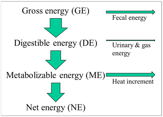 Figure 1). We thus differentiate between the gross energy content of the food (as determined by a bomb calorimeter), the digestible energy content (subtracting fecal energy), the metabolizable energy content (subtracting the urinary and gaseous (e.g., methane) energy losses), and lastly, the net energy content. The net energy content is the amount of energy the pig has available to support metabolism or growth, e.g., to exercise or grow tissue, such as muscle or adipose tissue. As an example, maize contains the following in kcal/kg: gross energy, 3933; digestible energy, 3451; metabolizable energy, 3395; and net energy, 2672 [