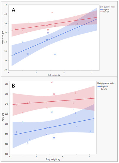 Figure 9B) indicates that food intake was positively correlated with adiposity; eating more food resulted in slightly fatter and less muscular pigs (this is very much calorie counting). The number of meals/day (i.e., the inverse of the meal size) also had an effect; pigs that ate more frequently and thus had smaller meals were less fat and more muscular. In fact, this is quite logical, given the glycemia story above. Smaller meals mean less stimulation of blood glucose and insulin; glucose ends up less in the ‘red’ (‘danger’) zone (