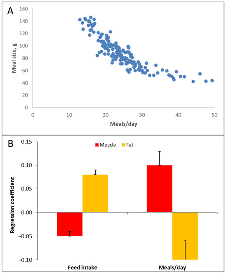 Figure 9A shows that an inverse relationship exists between the number of meals per day and the meal size. Multiplying these two values equals the total food intake per day. The correlation analysis (