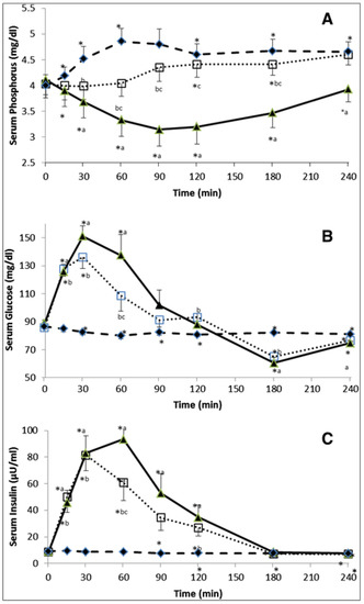 31] elegantly showed that blood phosphate levels were inversely related to blood glucose levels during a glycemia challenge; this drop in blood phosphate could be prevented by supplementation of phosphate at the start of the glucose challenge (