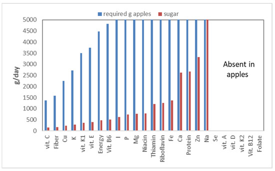 Figure 18—while for iodine (I) to sodium (Na), the required intake is above 5000 g/d, or well above 500 g of sugars per day. This graph also ignores bio-availability; not all nutrients contained in apples are indeed accessible for absorption by the intestines. Thus, in reality, the required intakes should be even higher.