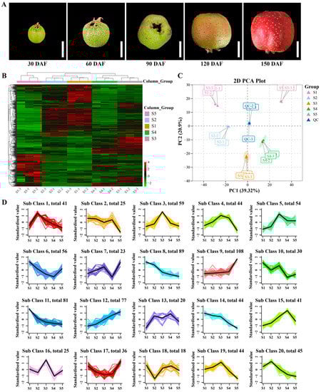 Dynamic metabolome of hawthorn fruit during development. (A) Fruit morphologies of ‘Shandong Dajinxing’ at five developmental stages; (B) heat map of all metabolites identified in hawthorn fruit at the five developmental stages; (C) principal component analysis of metabolomic data from hawthorn fruits at the five developmental stages; (D) cluster analysis of all 998 metabolites according to their concentration trends among the five fruit developmental stages. S1, S2, S3, S4, and S5 represent the five developmental stages of hawthorn fruit: S1, 30 days after full-bloom (DAF); S2, 60 DAF; S3, 90 DAF; S4, 120 DAF; and S5, 150 DAF.