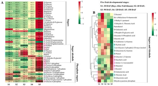 Sugar and alcohol metabolites detected at the five fruit developmental stages through broadly targeted UPLC-MS/MS. (A) Types and contents of sugars, sugar alcohols, and phosphate sugars in ‘Shandong Dajinxing’ fruits at the five developmental stages. S1, S2, S3, S4, and S5 represent the five fruit developmental stages of 30, 60, 90, 120, and 150 days after full-bloom (DAF), respectively. The first period of 30 DAF was used as a calibration value to calculate metabolite ploidy across the five periods. Significance analysis was performed using SPSS software with Tukey’s test and using a threshold of p < 0.05; the results are indicated by lowercase letters a, b, c, d, and e in the figure. Different letters indicate different levels of significance for comparisons between two samples. (B) Changes in the contents of other sugar and alcohol metabolites across the five periods of fruit development. Different colors on the heat map indicate the proportional contents of each metabolite, as determined based on the mean peak response area normalized to an R scale. Three independent biological replicates were assessed for each period.
