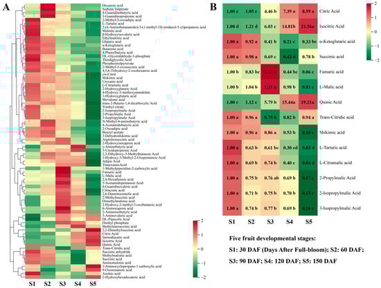 Changes in organic acid metabolism among the five developmental stages of fruit. (A) Heat map of the metabolism of 76 organic acids; (B) heat map and differential fold changes in the metabolism of 14 representative organic acids. The first period of 30 days after full-bloom (DAF) was used as a calibration value to calculate metabolite ploidy across the five periods. Significance analysis was performed using SPSS software with Tukey’s test and using a threshold of p < 0.05; the results are indicated by lowercase letters a, b, c, d, and e in the figure. Different letters indicate different levels of significance for comparisons between two samples. Different colors on the heat map indicate the proportional contents of each metabolite, as determined based on the mean peak response area normalized to an R scale. Three independent biological replicates were assessed for each period.