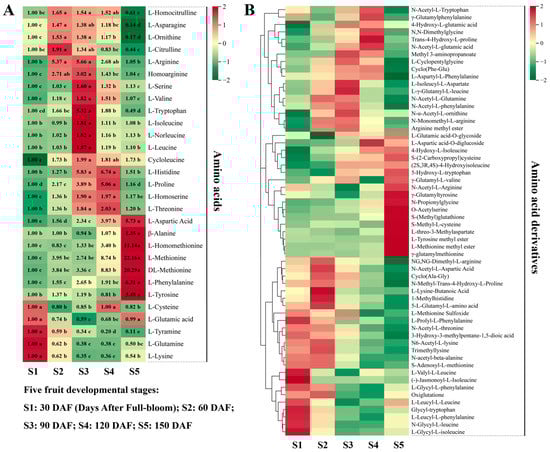 Amino acids (left) and their derivatives (right) detected through broadly targeted UPLC-MC/MS at the five fruit developmental stages. (A) Ploidy changes in each amino acid metabolite across the five periods of fruit development are depicted in heat map format; Significance analysis was performed using SPSS software with Tukey’s test and using a threshold of p < 0.05, the results are indicated by lowercase letters a, b, c, d, and e in the figure. (B) heat map of the metabolism of amino acid derivatives.