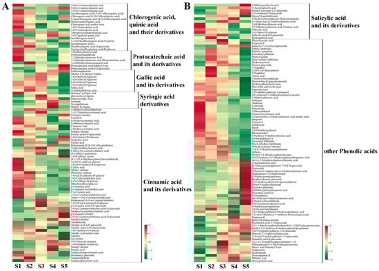 Cumulative distributions of phenolic acid compounds detected through broadly targeted UPLC-MC/MS at the five fruit developmental stages. (A) Metabolic heat map of chlorogenic/quinic acid and its derivatives, protocatechuic acid and its derivatives, gallic acid and its derivatives, syringic acid derivatives, and cinnamic acid and its derivatives; (B) metabolic heat map of salicylic acid and its derivatives, along with other phenolic acids.