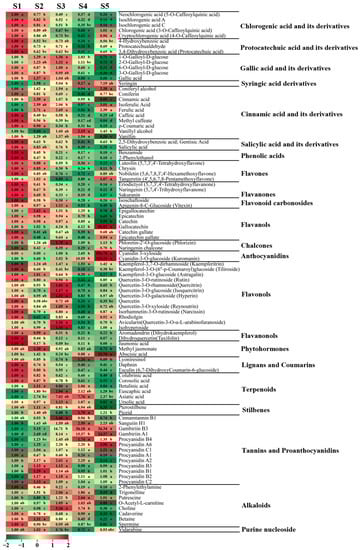 A total of 15 metabolites belonged to the flavanol group of substances. Among these substances, gallocatechin was 58.82-fold more abundant during S5 than during S1 (Figure 6). Additionally, catechin and catechin derivatives were less abundant during fruit ripening than at the beginning of fruit development.