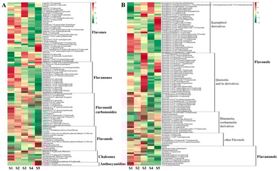 Cumulative distributions of flavonoids detected through broadly targeted UPLC-MC/MS at the five fruit developmental stages. (A) Metabolic heat map of flavonoids, flavanones, flavonoid carbonosides, flavanols, chalcones, and anthocyanidins; (B) metabolic heat map of flavonols and flavanonols.