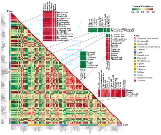 For flavonoids, significant positive correlations were observed between luteolin and chrysin (flavonoids), naringenin and sakuranin (flavanones), vitexin (flavonoid carbonosides), and epicatechin and catechin (flavanols); highly significant positive correlations were observed among rutin, isoquercitrin, hyperin, isohyperoside, and reynoutrin (flavonols) (black triangular box in Figure 8). Anthocyanidins were significantly correlated with various metabolites, such that significant or highly significant positive correlations were observed for nine sugars, three organic acids, six amino acids, and five lipids; negative correlations were observed for four nucleotides, four vitamins excluding nicotinamide, five phenolic acids including cinnamic acid, two flavonoids, two flavanones, one flavonoid carbonoside, two flavanols (catechin and epicatechin), two triterpenes (corosolic acid and maslinic acid), one stilbene (pterostilbene), procyanidin A2, and three amines (cadaverine, spermine, and betaine). Additionally, anthocyanidins exhibited a highly significant positive correlation with abscisic acid.