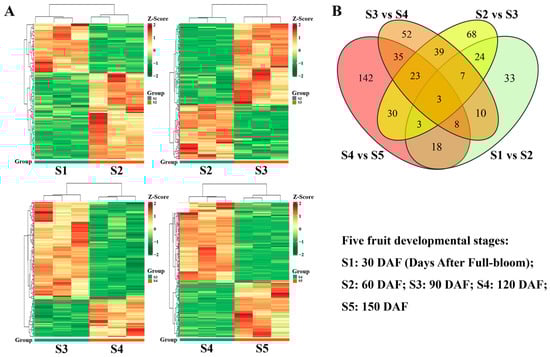 Differential accumulation of metabolites among the five stages of fruit development. (A) Heat map of differential metabolites between periods S1 and S2, S2 and S3, S3 and S4, and S4 and S5 (three independent replicates of each phase are shown); (B) Venn diagrams of differential metabolites between periods S1 and S2, S2 and S3, S3 and S4, and S4 and S5.