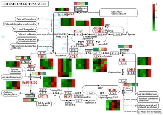 The expression patterns of DEGs involved in the TCA cycle metabolic pathway are shown in Figure 10. Many genes involved in the TCA cycle were upregulated during fruit development, however, the levels of intermediates in the TCA cycle (e.g., α-ketoglutarate, fumaric acid, citric acid, and isocitric acid) were reduced during fruit development, suggesting that the genes involved in the TCA cycle were activated but the corresponding metabolites were consumed as substrates for downstream metabolic pathways; the upregulated expression level of CS (citrate synthase gene) corresponded to the accumulation of citric acid during fruit development. A large number of genes involved in glycolysis/gluconeogenesis were also upregulated during fruit development (Figure S8), while numerous sugar metabolites (e.g., fructose, glucose, and sucrose) exhibited upward trends across the five periods of fruit development (Figure 2), suggesting that genes involved in glycolysis/gluconeogenesis were activated and the corresponding metabolites began to accumulate. Additionally, phosphoenolpyruvate is a key compound involved in many metabolic processes including glycolysis/gluconeogenesis, the TCA cycle, and pyruvate metabolism. The phosphoenolpyruvate content was highest in hawthorn fruits at the early stage of development, then gradually decreased. The accumulation pattern of phosphoenolpyruvate was negatively correlated with the expression level of ENO (enolase gene), which increased during fruit development and reached its maximum expression level at fruit ripening (Figure S8).