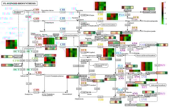 In total, 199 flavonoid compounds were detected in hawthorn fruit (Figure 7), including flavonoids, flavanones, flavonoid carbonosides, flavanols, chalcones, anthocyanidins, flavonols, and flavanonol metabolites. Compared with the S1 period, most flavonoid levels decreased during the S2 period and a few increased during the S3 period; subsequently, significant reductions in numerous flavonoids were observed during the S4 and S5 stages (Figure 6 and Figure 7), indicating the inhibition of flavonoid biosynthesis during fruit ripening.