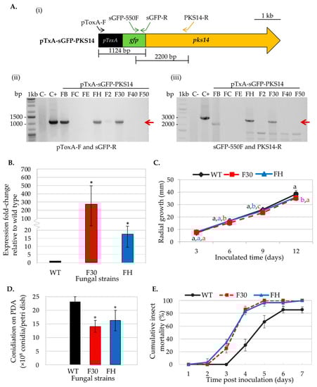 Phenotype characterization of OEpks14 strains. (A) Ectopic integration of the pks14-overexpression cassette was verified by PCR with specific primers (i). OEpks14 strains FH and F30 showed the expected bands at 1124 bp (red arrow) using primers pToxA-F and sGFP-R, specific for the ToxA promoter and sGFP, respectively (ii), and 2200 bp (red arrow) using primers sGFP-550F and PKS14-R, specific for the sGFP and pks14, respectively (iii). B. bassiana BCC2660 genomic DNA and the vector pTxA-sGFP-PKS14 were used as negative (C−) and positive (C+) controls, respectively. (B) Gene expression level, (C) radial growth, (D) conidiation, and (E) insect mortality were impacted by OEpks14 strains FH and F30. The letters indicate a significant difference (ANOVA, p < 0.05). Asterisks indicate statistical significance (t-test, p < 0.05).