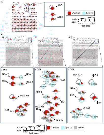 Molecular networking comparisons between OEpks14 and OEpks15 strains in culture and in vivo were subsequently performed. In culture, expression of insect-virulence metabolites, including BEA A/F (m/z 798.4275, calcd. for C46H59N3O9H+, Δ−7.14 ppm), BEA B (m/z 812.4430, calcd. for C47H61N3O9H+, Δ−6.89 ppm), BEA C (m/z 848.4400, calcd. for C48H63N3O9Na+, Δ−7.31 ppm), BAS (m/z 909.6107, calcd. for C48H84N4O12H+, Δ−6.27 ppm), and ENN A (m/z 682.4598, calcd. for C36H63N3O9H+, Δ−6.59 ppm) were observed only for OEpks14, and FER levels were higher for OEpks14 compared OEpks15 (Figure 6). In contrast, in vivo comparison showed that several insect-virulence compounds were only detected from OEpks15-injected BAWs throughout the experimental period (3, 5, and 7 DPI). These compounds were BEA (m/z 784.4158, calcd. for C45H57N3O9H+, Δ−1.91 ppm), BEA A/F (m/z 798.4307, calcd. for C46H59N3O9H+, Δ−3.13 ppm), BEA B (m/z 812.4458, calcd. for C47H61N3O9H+, Δ−3.45 ppm), BEA D (m/z 770.3982, calcd. for C44H55N3O9H+, Δ−4.54 ppm), FER (m/z 771.2464, calcd. for C28H44FeN9O13H+, Δ−2.85 ppm), and BAS (m/z 931.5942, calcd. for C48H84N4O12Na+, Δ−4.40 ppm) (Figure 7).