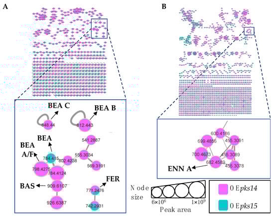 Molecular networking of insect-virulence metabolites and a siderophore from OEpks14 (pink) and OEpks15 (green) strains in culture identified beauvericin (BEA) and ferricrocin (FER) from both strains. (A) Beauvericin A/F (BEA A/F), beauvericin B (BEA B), beauvericin C (BEA C), and bassianolide (BAS) were found exclusively from OEpks14 cells. (B) Enniatin A (ENN A) was found exclusively in OEpks14 culture broth. Node sizes represent the sums of chromatographic peak areas, and pie charts indicate chromatographic peak-area proportions for the detected insect virulence factors.