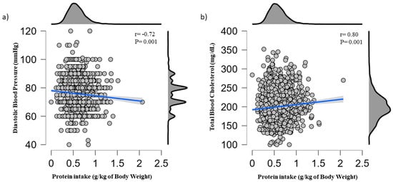 The normal distribution of variables was ascertained via the Shapiro–Wilk test. Continuous variables are expressed as the mean ± standard deviation (SD) or absolute numbers, percentages. Tertiles and quintiles for BW-adjusted daily protein intake were: ≤0.79, 0.80–0.99, and ≥1.00; and ≤0.42, 0.43–0.52, 0.53–0.60, 0.61–0.70, and ≥0.71. Regression analysis was conducted to test the association between protein intake and cardiometabolic risk factors. Scatterplots were constructed using the variables significantly associated. Pearson’s correlation was conducted to quantify the association among the variables analyzed in the Scatterplots. The final model was adjusted for age, sex, BMI, energy intake, sodium, potassium, calcium, magnesium, physical activity, active smoking, fasting state (blood glucose), and antihypertensive (for systolic (SBP) and diastolic BP (DBP)), cholesterol-lowering (for total blood cholesterol), and antidiabetic (for blood glucose) drugs.