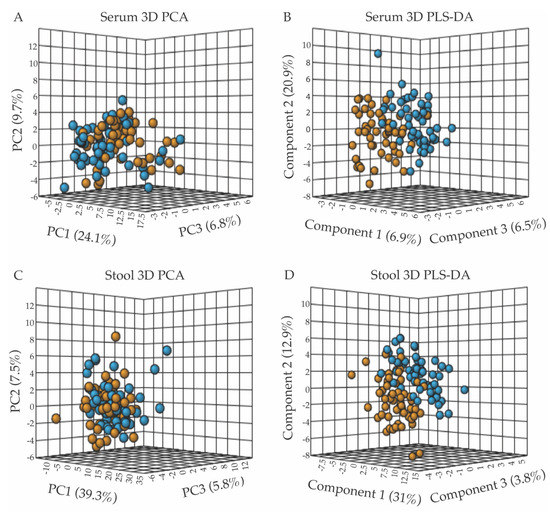 Multivariate statistical analyses of serum and fecal metabolic profiles separate the FD patient population (orange) from the control relative group (blue), with panels (A,B) presenting the 3D-PCA and 3D-PLS-DA scores plots from the analyses of serum metabolite patterns, and panels (C,D) those from fecal sample analyses. (A) 3D-PCA scores plot obtained from the principal component analysis (PCA) of serum metabolite patterns reveals little separation between the FD patients and healthy control relative groups, with PC1, 2, and 3 accounting for 40.6% of the variance. (B) 3D-PLS-DA scores plot obtained from partial least-squares discriminant analysis (PLS-DA) of serum metabolites resulted in the separate clustering of the FD patient and healthy relative control groups, with components 1–3 accounting for 34.3% of the variance. (C) 3D-PCA scores plot of stool metabolite profiles, revealing minimal separation between groups, with PC1-3 accounting for 52.6% of the variance. (D) 3D-PLS-DA scores plot analysis of stool metabolite profiles indicated a clear separation of the FD patient group from the control group based on distinct fecal polar metabolomes, with components 1–3 accounting for 47.7% of the variance. All data shown in Figure 1 (3D-PCA and PLS-DA scores plots) were generated using the MetaboAnalyst v.4.0 software (Edmonton, AB, Canada).