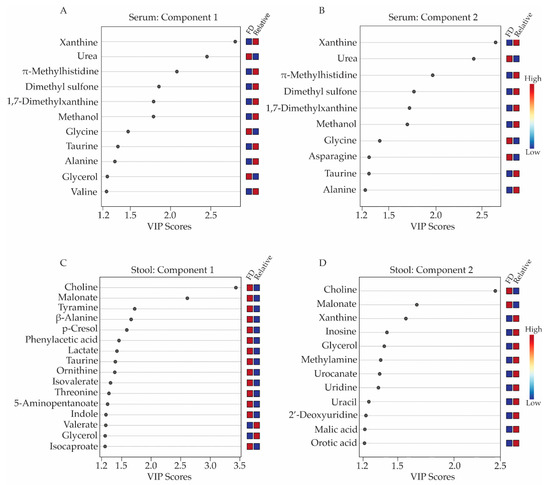 Variable importance in projection (VIP) score plots corresponding to the first two components of the 3D-PLS-DA models obtained from serum and stool metabolite profiles. Metabolites with VIP scores ≥ 1.2 were considered a significant contributor to the distinct clustering of the FD patient and the healthy relative control groups along components 1 and 2 of the 3D-PLS-DA scores plots. Panels (A,B) display the VIP score plots for the serum metabolites, while panels (C,D) presents the VIP score plots for the stool metabolite profiles. Relative metabolite levels range from high (red boxes) to low (blue boxes), indicating whether the metabolite concentrations are higher or lower in the FD patient group relative to the levels measured in the healthy relative control group. All VIP scores plots shown in Figure 2 have been generated from PLS-DA modeling conducted in MetaboAnalyst v.4.0 (Edmonton, AB, Canada).