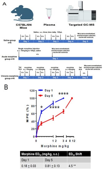Schematization of study design and morphine-tolerance mice model development. (A) Schematic depicting morphine dosing and behavioral testing paradigm for morphine-induced tolerance experiments. (B) Dose–response curve of morphine in C57BL/6N mice. Cumulative dose–response studies were performed before (Day 1) and after (Day 5) morphine treatment. Error bars represent SEM from 6 mice. * p, 0.05, ** p, 0.001 and **** p, 0.0001 for an unpaired Student’s t test.