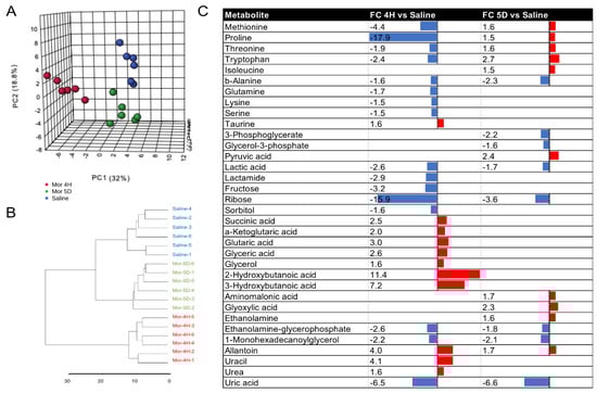Acute or chronic morphine intake is associated with distinct plasma metabolic signatures. (A) Principal component analysis of metabolic profiles detected with GC–MS in mouse plasma after acute, 4 h (Mor 4H), chronic, 5 days (Mor 5D), or after saline (Saline) injection of morphine; (B) hierarchical clustering of metabolic signatures in distinct mice groups; (C) univariate analysis of significant metabolic changes occurring in mouse plasma after acute (4H vs. Saline) or chronic (5D vs. Saline) intake of morphine in tolerant mice. Metabolites were considered significant for p-values < 0.05 in significance t-testing (2-tailed, heteroscedastic), and absolute fold change (FC) > 1.5; red bar: upregulation, blue bar: downregulation.