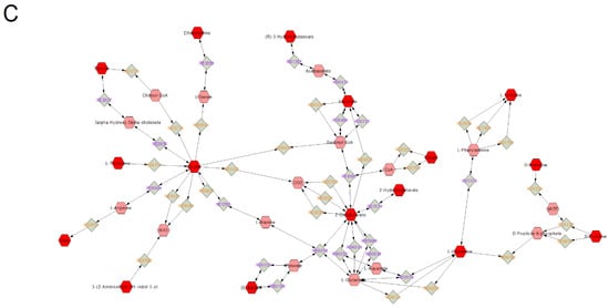 Metabolite abundances were examined with univariate statistical analysis in R Studio (t-test significance analysis, two-tailed distribution with heteroscedastic variance). Metabolite abundances were considered significantly different for p < 0.05 and absolute fold change > +1.5. Prior multivariate analysis (principal component analysis (PCA), partial least-squares discriminant analysis (PLSDA)) metabolite abundance was normalized as follows: log-transformed and autoscaled (i.e., mean-centered and divided by the standard deviation of each variable) to normal distribution. Metabolite abundances with fewer than three replicates were excluded from analysis. The PCA and PLSDA of normalized metabolite abundance were performed using MetaboAnalyst 5.0 with the Rscript chemometrics, R, [37]. Sample hierarchical clustering was performed using the hclust function in the stat. R package (Ward clustering with Euclidean distance measure). Metabolite network analysis was performed with MetScape 3 in Cytoscape [38,39].