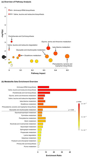These 20 significant metabolites were subjected to pathway and enrichment analyses using MetaboAnalyst 5.0. The associated metabolic pathways are shown in Figure 2a, wherein nine pathways were found to be significantly related to C. gracilis feeding: “aminoacyl-tRNA biosynthesis,” “valine, leucine and isoleucine biosynthesis”, “pantothenate and CoA biosynthesis”, “glycine, serine and threonine metabolism,” “valine, leucine and isoleucine degradation”, “β-alanine metabolism”, “glutathione metabolism”, “phenylalanine, tyrosine and tryptophan biosynthesis,” and “glyoxylate and dicarboxylate metabolism”. Similarly, the enrichment ratio and p-values suggested that these nine pathways were significantly enriched (Figure 2b).