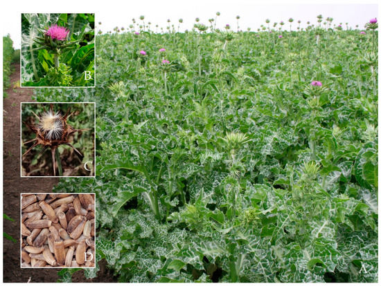 Silybum marianum (L.) Gaertn. (milk thistle, MT, Figure 1), a member of the Asteraceae family, has been used since ancient times as a medicinal plant [1,2,3]. Silymarin, a mixture of unique, antioxidant flavonolignans, is the main bioactive component of MT. Silymarin is indicated to prevent particularly liver and biliary tract disorders and oncological conditions, to support the treatment of hepatitis C, HIV, diabetes, and hypercholesterolemia, as well as to increase lactation [4,5,6,7,8]. MT also has promising potential for other applications ranging from human consumption to industrial exploitation, including the use in dermatological and cosmetic preparations [9,10,11,12]. Although its fruits (achenes), often referred to as seeds (Figure 1D), contain the highest amount of silymarin, other parts of the plant have also been used as traditional remedies [13,14]. Native from Southern Europe, Asia Minor, the Southern Russian Federation, and Northern Africa, MT is spread nowadays in warm and dry regions throughout the world [15], and it is cultivated for the production of silymarin in most areas of Europe, Asia, North and South America, and Southern Australia [10,16,17].