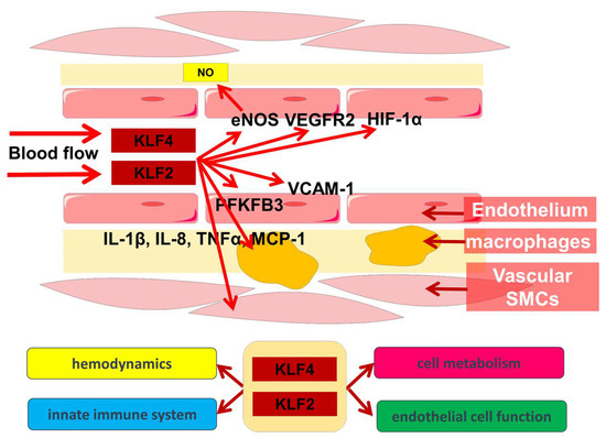 Involvement of KLF2 and KLF4 in hemodynamic, metabolic, and innate immune system cross-links.