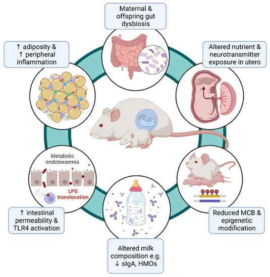 The specific absence of certain or all microbes during early life has been shown to affect behaviour in later life. For example, Sudo et al. (2004) showed that GF mice exhibit downregulated NMDA receptor subunit NR2A in response to acute restraint stress, which was reversed by the microbial reconstitution of Bifidobacteria (but not Escherichia coli) neonatally []. Stress-induced changes in brain gene expression were not reversible by gut microbial reconstitution in adulthood. This seminal study established the importance of the commensal microbiota in the normal conditioning of the HPA axis. An altered gut microbiota due to a poor maternal diet likely also has a pervasive effect on metabolites reaching the foetus, which may prime offspring for disease. Germ-free mice colonised with the gut microbiota of offspring born to obese dams have an increased intestinal permeability (determined by increased plasma fluorescein isothiocyanate dextran levels), hepatic inflammation (increased hepatic TNF mRNA and hepatic macrophage count), and susceptibility to non-alcoholic fatty liver disease (NAFLD), determined by a histological examination of liver sections for steatosis and the infiltration of inflammatory cells []. Clearly, maternal microbial changes that occur because of perinatal obesity affect the composition of vertically transmitted metabolites to offspring during foetal and neonatal development.