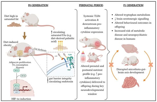 Factors associated with maternal pregravid obesity should not be considered in isolation when investigating their effects on the offspring brain and behaviour (Figure 2). Multiple perturbations coalesce to alter the normal course of neurodevelopment in offspring. For example, TLR4 activation links maternal obesity with increased immune activation via both an altered microbiota composition (endotoxin mediated inflammation), adipocyte proliferation (hypoxia and HIF-1 mediated inflammation []), and by diet, whereby saturated fatty acids can also activate TLR4 [,,] (Figure 2). A state of chronic low-grade inflammation, exacerbated by normal immunological changes that occur during gestation, is likely to have an impact on the development of normal brain circuitry, particularly through alterations in the availability of serotonin during key neurodevelopmental windows. Sex differences may also occur, with females perhaps being more vulnerable to the effects of maternal obesity on developing depressive behaviour.
