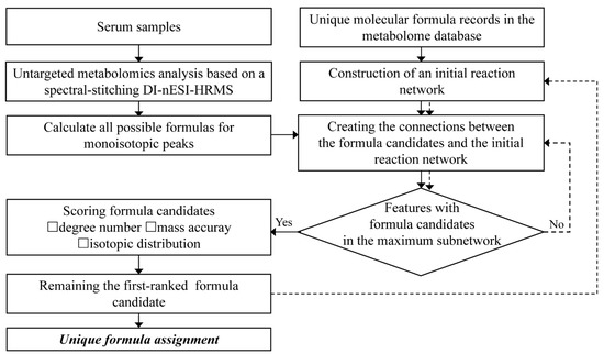 In this work, a serum metabolome characterization method was proposed to fully explore the potential of DI-nESI-HRMS. To enhance the coverage and accuracy of unique formula assignment, a reaction network was constructed and endogenous metabolites from the HMDB served as initial seed nodes. A scoring system was established to further screen reliable molecular formulas from the possible candidates based on the topological relationship in the reaction network, mass accuracy, and isotopic fine structure. Finally, the developed method was applied to a high-throughput study of serum metabolomics in diabetes.