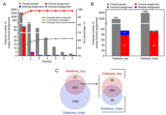 A pooled serum sample spiked 78 reference standards was used for method validation. As shown in Figure 4A, 96 monoisotopic MS features were detected to be associated with 68 reference standards, which were assigned 353 potential formula candidates. Using the workflow described above, 95 out of the 96 monoisotopic MS features were successfully assigned with unique formula candidates through the two rounds of assignments (Figure 4A, stacked column). A total of 89 out of 95 assigned features were correctly allocated unique formulas. As a result, the coverage and accuracy rates were 98.9% (red solid line) and 93.6% (red dash line), respectively. For the spiked pooled serum sample, 3140 monoisotopic MS features were assigned with 19,474 possible formula candidates. Among these features, 1958 features were assigned with unique formula candidates after seven rounds of assignments (grey columns). The coverage rate was up to 62.3% (grey solid line). It is noteworthy that 18.1% of features were assigned between the second and seventh rounds.