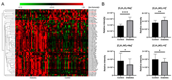 (A) The heat map of significantly changed ion formulas between control and diabetes groups, (B) Changes of [C6H12O6+Na]+, [C6H13NO2+H]+, [C6H11NO2+Na]+ and [C7H15NO3+H]+ between control and diabetes groups, respectively. **** p < 0.0001, ** p < 0.01, * p < 0.05.