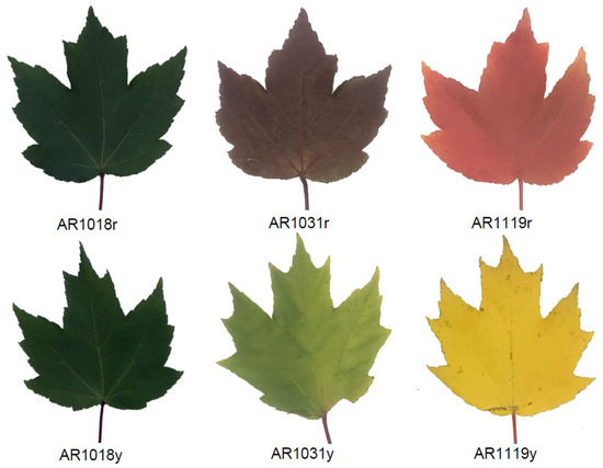 The leaves used in this study were from red and yellow strains. Note: the leaves were collected from red and yellow strains at three different times, including on 18 October 2018 (AR1018r or AR1018y); 31 October 2018 (AR1031r or AR1031y); and 19 November 2018 (AR1119r or AR1119y), respectively.