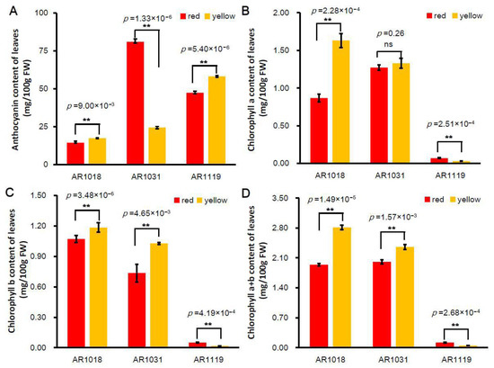 Pigment content of differently colored leaves in red maple. Note: (A) anthocyanin content, (B) chlorophyll-a content, (C) chlorophyll-b content, and (D) chlorophyll-a + b content (averages ± standard errors; ** p < 0.01; ns: not significant).