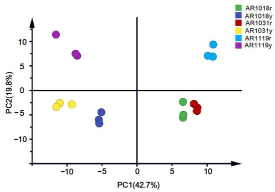 Then, we performed a principal component analysis (PCA) on the data to better understand the overall flavonoid metabolome (Figure 3). The PC1 and PC2 explained 42.7% and 19.8% of the metabolite variations among all the samples, respectively. The red and yellow strains could be separated into different groups. Moreover, the samples from different developmental stages were well distinguished (Figure 4).