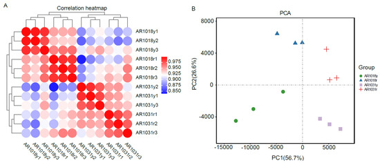 Twelve libraries of red maple in the two leaf developmental stages were sequenced using the Illumina paired-end sequencing method with three biological replicates per stage, yielding 41 to 62 million high-quality clean reads, with 53 million clean reads per library on average. An overview of the RNA-seq data for the twelve libraries is shown in Table 1. In total, 51,556,563, 56,453,487, 49,761,007, and 55,327,094 clean reads for AR1018y, AR1018r, AR1031y, and AR1031r were produced, respectively, via RNA-seq on the Illumina Hiseq platform, and 639.29 million high-quality clean reads were obtained from the 12 libraries. Each sample′s average GC content was 43.13%. The Q30 ranged from 90.43% to 92.59%, with an average of 91.91%. Ultimately, 103,829 unigenes were assembled from the 12 libraries (Table 1). The Pearson correlations among the AR1018r, AR1018y, AR1031r, and AR1031y replicates ranged from 0.90 to 1 (Figure 6A). The PCA showed that AR1018r, AR1018y, AR1031r, and AR1031y were separately aggregated. The PC1 and PC2 explained 56.7% and 26.6% of the gene expression variations among all the samples, respectively, indicating striking differences in gene expression profiles (Figure 6B).