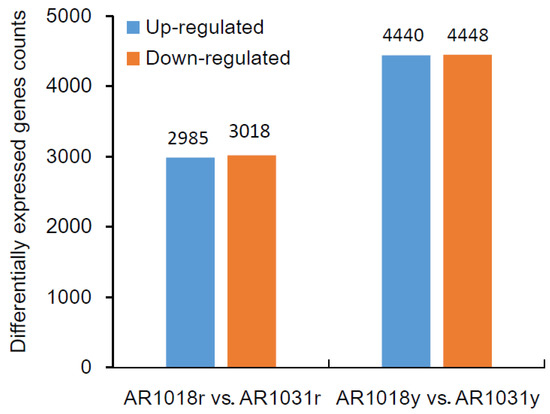 To identify differentially expressed genes (DEGs) of the red maple leaves at different developmental stages, the criteria of padj (adjusted p-value) < 0.05 and |log2 (fold change)| > 1 were used. The differential expression analysis of the two samples was performed using the DEGseq R package. A total of 6003 DEGs were identified between AR1018r and AR1031r, with 2985 and 3018 genes being up-regulated and down-regulated in AR1031r, respectively. In total, 8918 DEGs were identified between AR1018y and AR1031y. Additionally, 4440 genes were up-regulated and 4448 genes were down-regulated in AR1031y (Figure 7, Supplemental Table S3).